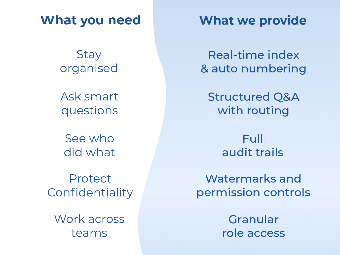 On the buy-side, your edge is in the detail. We help you navigate the data room fast, surface key insights, and ask the right questions.